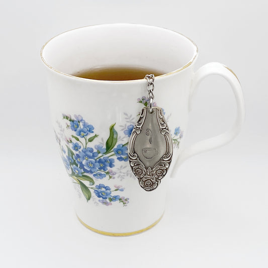 Silvery Mist 1955 Tea Infuser, Loose Leaf Tea Steeper, Heart Shape Tea Diffuser with chain and Vintage Silverware Charm, Stainless Steel Tea Ball Strainer