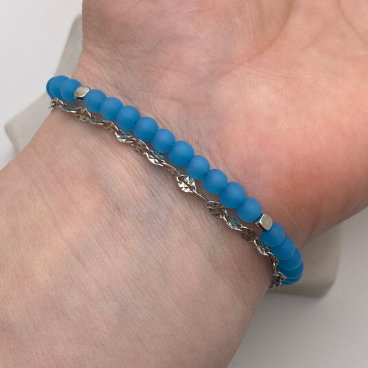 Desire 1940, Sky Blue Sea Glass, Beaded Silverware Stretch Bracelet, Vintage Spoon Handle, Antique Spoon Bracelet