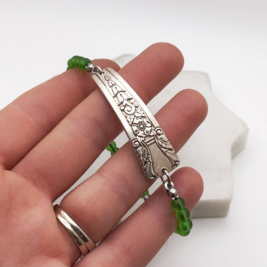 Secret Garden, Frosted Green Sea Glass, Beaded Silverware Stretch Bracelet, Vintage Spoon Handle, Antique Spoon Bracelet