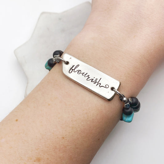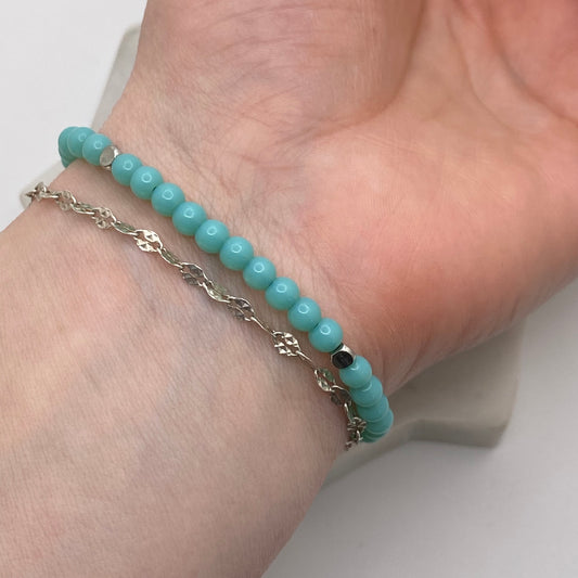 Spring Flower 1956, Turquoise Sea Glass, Beaded Silverware Stretch Bracelet, Vintage Spoon Handle, Antique Spoon Bracelet