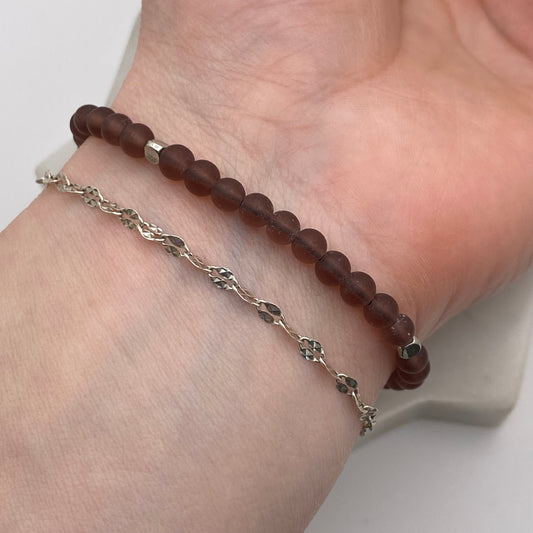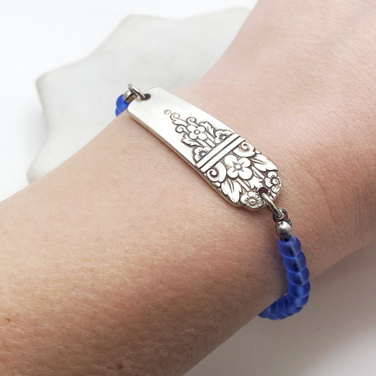 Margate 1938, Frosted Periwinkle Sea Glass, Beaded Silverware Stretch Bracelet, Vintage Spoon Handle, Antique Spoon Bracelet