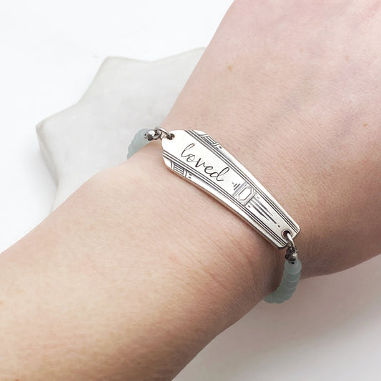 Loved, Paramount 1933, Pale Blue Sea Glass, Beaded Silverware Stretch Bracelet, Vintage Spoon Handle, Antique Spoon Bracelet