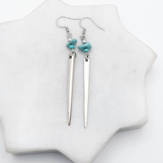 Fork Tine and Bead Drop Earrings (Turquoise), Reclaimed Silverware Earrings, Vintage Fork Jewelry