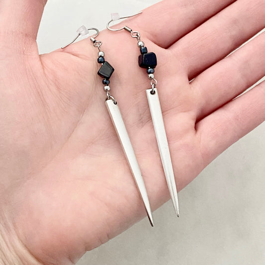 Fork Tine and Bead Drop Earrings (Midnight Blue), Reclaimed Silverware Earrings, Vintage Fork Jewelry