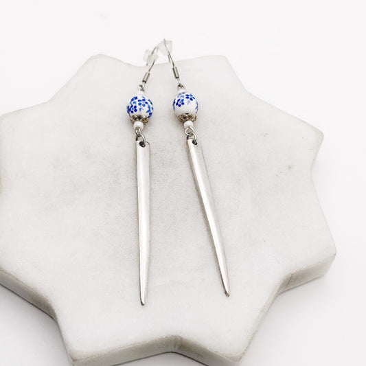 Fork Tine and Bead Drop Earrings (Blue & White Ceramic), Reclaimed Silverware Earrings, Vintage Fork Jewelry