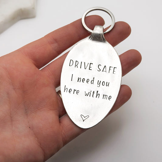 Drive Safe I Need You Here with Me, Hand Stamped Vintage Spoon Keychain