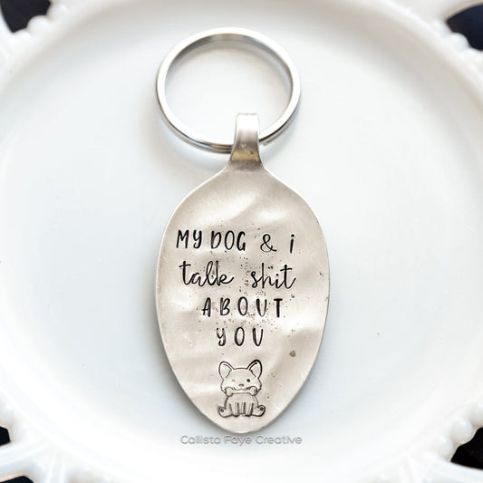 My Dog & I Talk Shit About You, Hand Stamped Vintage Spoon Keychain