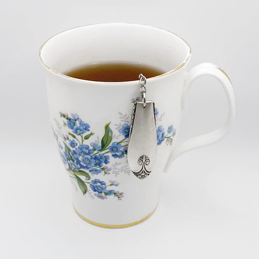 Exquisite 1940 Tea Infuser, Loose Leaf Tea Steeper, Heart Shape Tea Diffuser with chain and Vintage Silverware Charm, Stainless Steel Tea Ball Strainer
