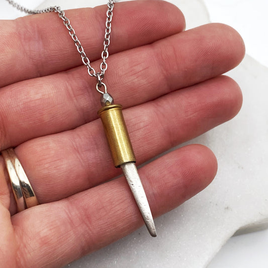 Fork Tine & 22 Casing Necklace, Bullet Shell Pendant, Vintage Silverware Necklace