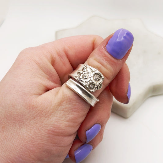 April 1950, Custom Size, RARE Spiral Ring, Vintage Sunflower Spoon Ring