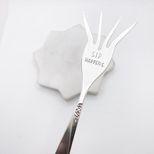 Sip Happens, Caesar Cocktail Fork, Bloody Mary Garnish Fork, Hand Stamped Vintage Fork