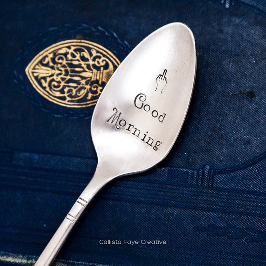 Good Morning (middle finger), Hand Stamped Vintage Spoon