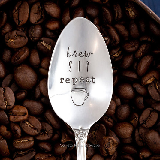 Brew Sip Repeat, Hand Stamped Vintage Spoon