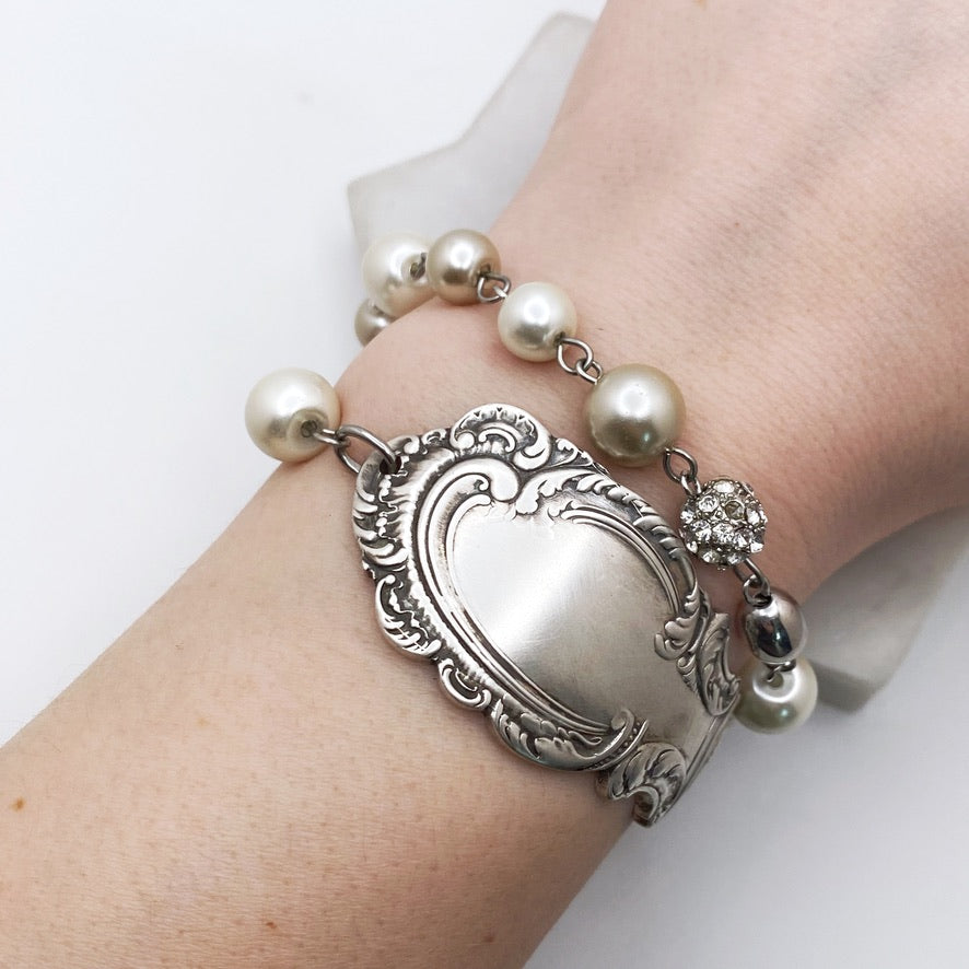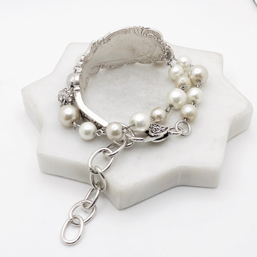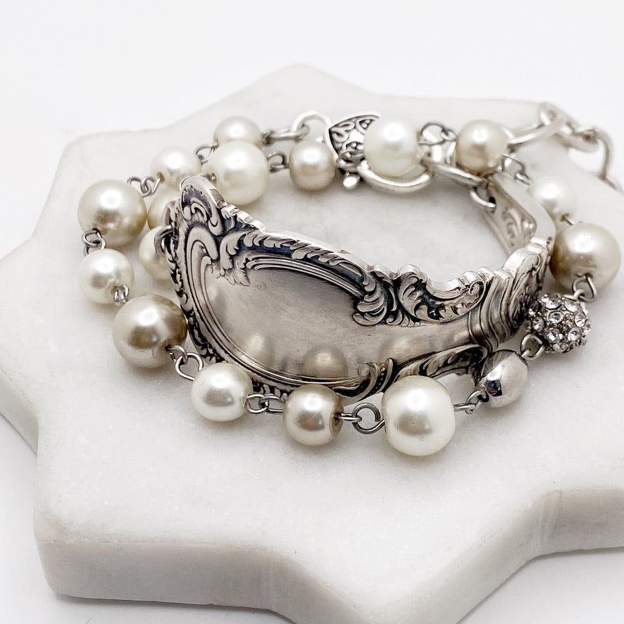 A unique and modern design from historical silverware. Hand formed to sit on the side of your wrist. The beaded portion is made from vintage jewelry & wraps twice around for an elegant and unique style.