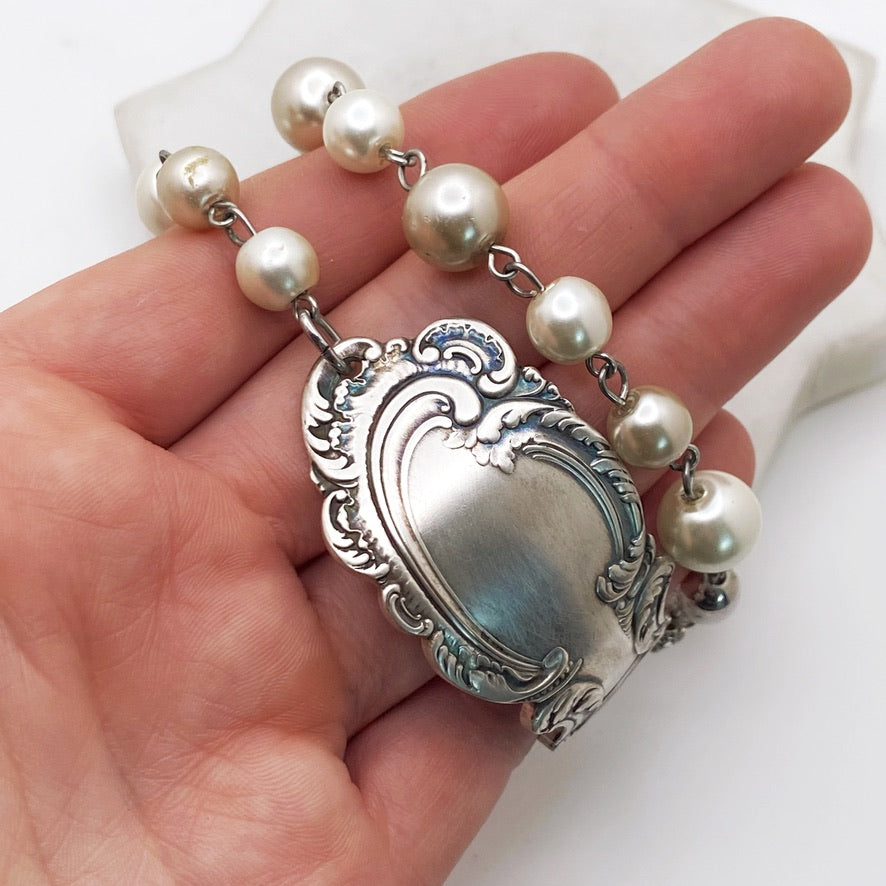 A true antique: this piece is made from a spoon that is over 100 years old. This is a RARE and highly coveted pattern. Comes in a small gift box.