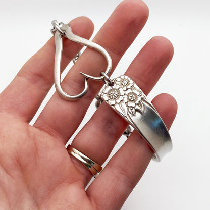 A unique and modern design from historical silverware; a beautiful silverware handle joined to curled fork tines. Shape and size of the heart will vary.
