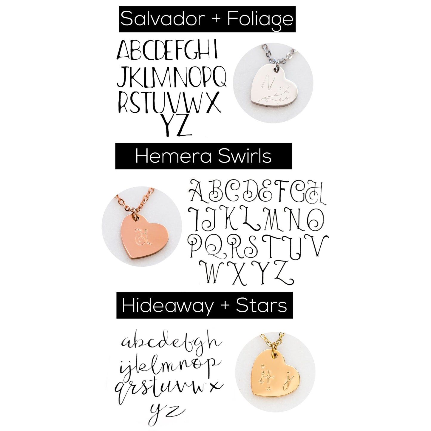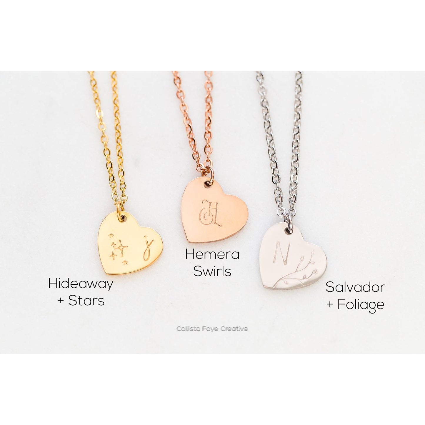 Dainty & minimal, the perfect jewelry for everyday. This necklace features a petite heart pendant that is hand stamped with the initial of your choice. Choose from several designs to accentuate your personalization. It looks beautiful on its own, or layered with your other favourite pieces. Made with care by me, for you to wear your love.