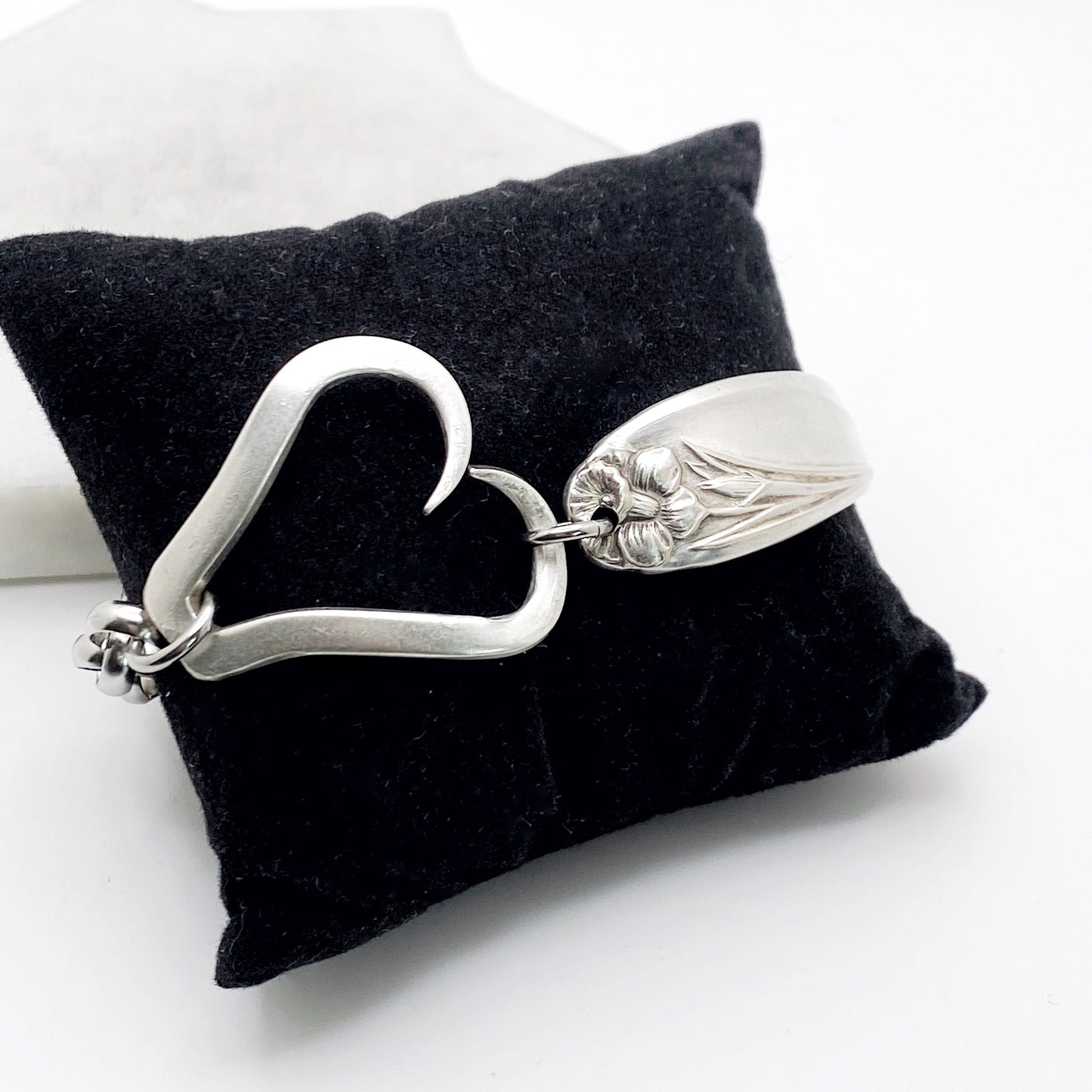 A unique and modern design from historical silverware; a beautiful silverware handle joined to curled fork tines. Shape and size of the heart will vary.