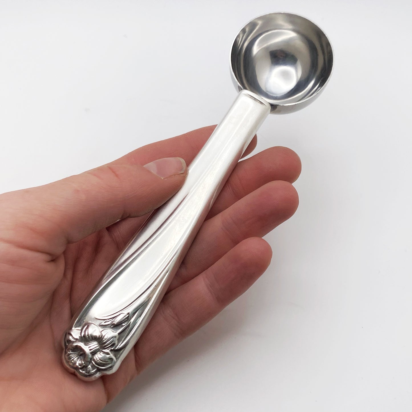 This tea measuring spoon has been made from the handle of a vintage dinner knife. Scoop measures 1 Tbsp (15 mL).