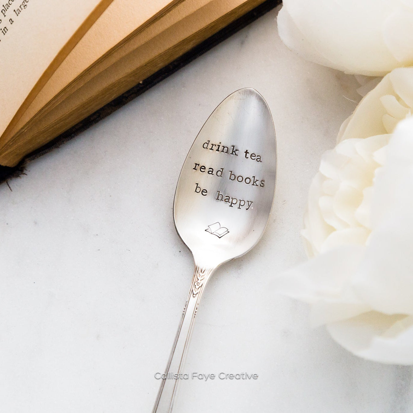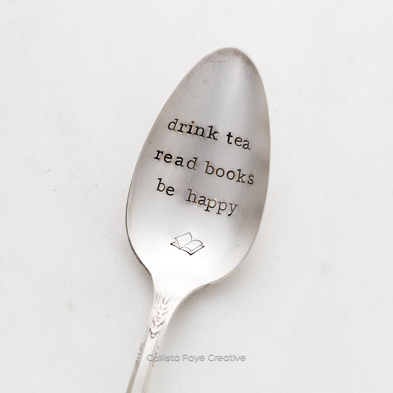 Drink Tea Read Books Be Happy, Hand Stamped Vintage Spoon