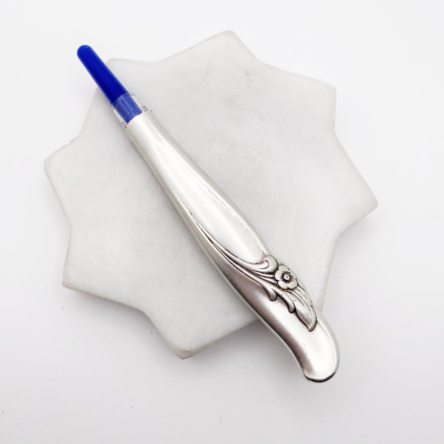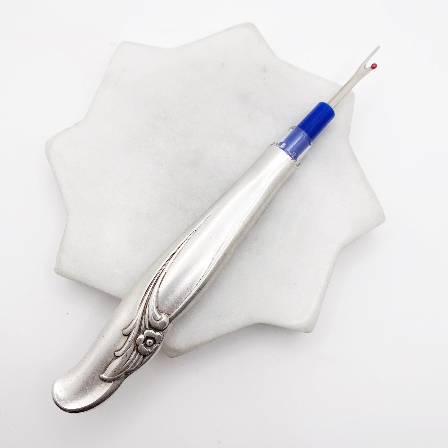 This seam ripper has been made from the handle of an antique dinner knife. Never lose your lid! The clear lid is fastened inside the vintage handle, simply flip the seam ripper around and it is ready to use. Your choice of several colours.