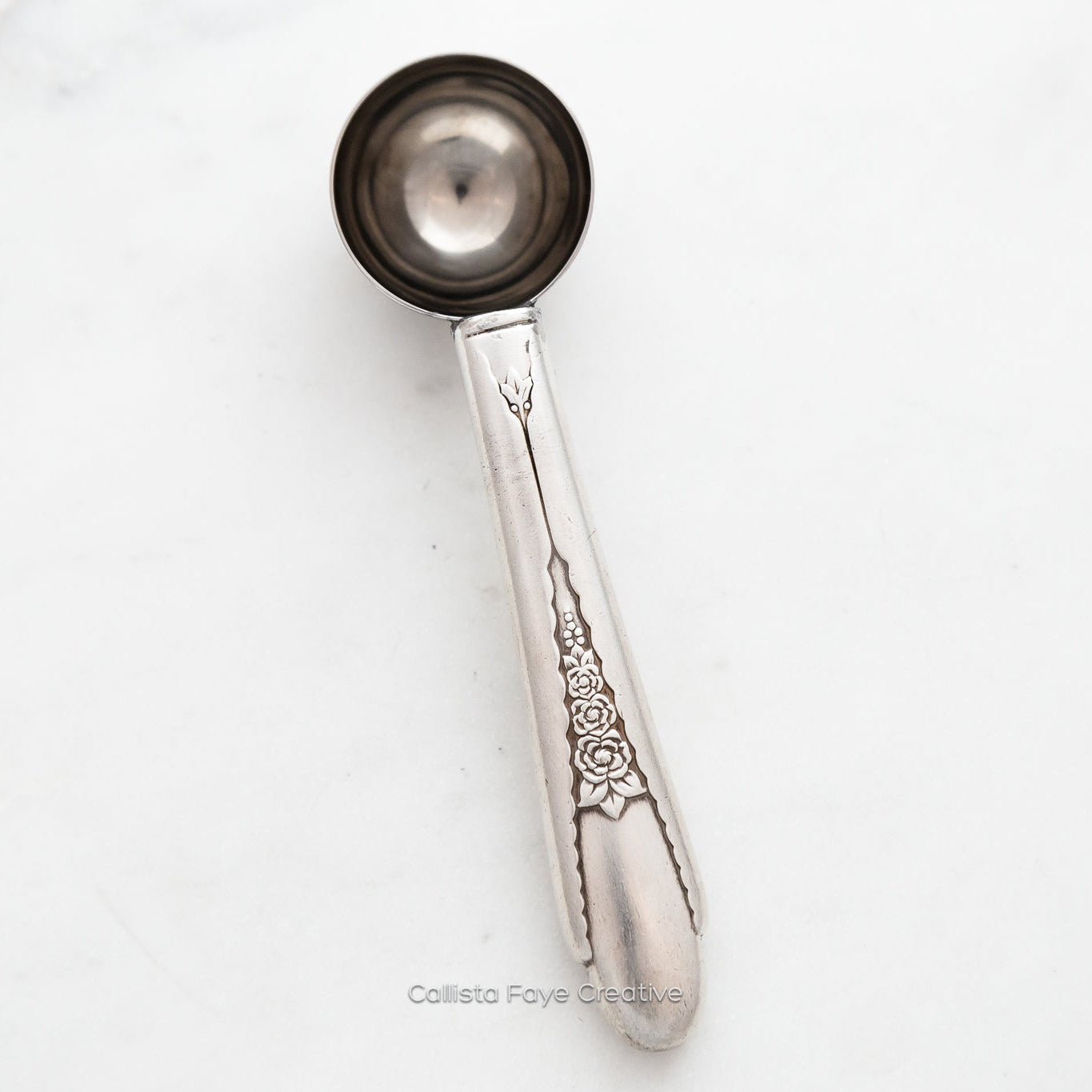 This tea measuring spoon has been made from the handle of a vintage dinner knife. Scoop measures 1 Tbsp (15 mL) - the "perfect spoon" for measuring loose tea according to a popular Canadian tea retailer.
