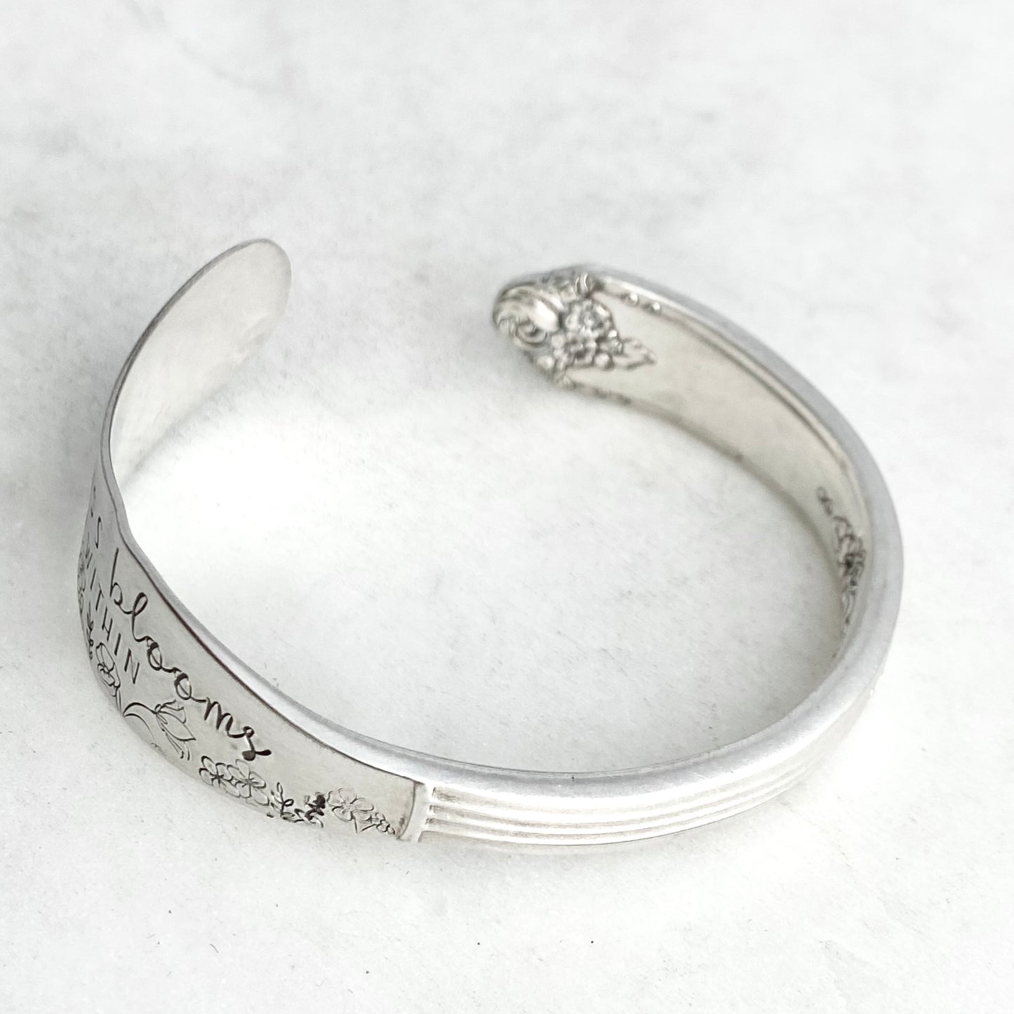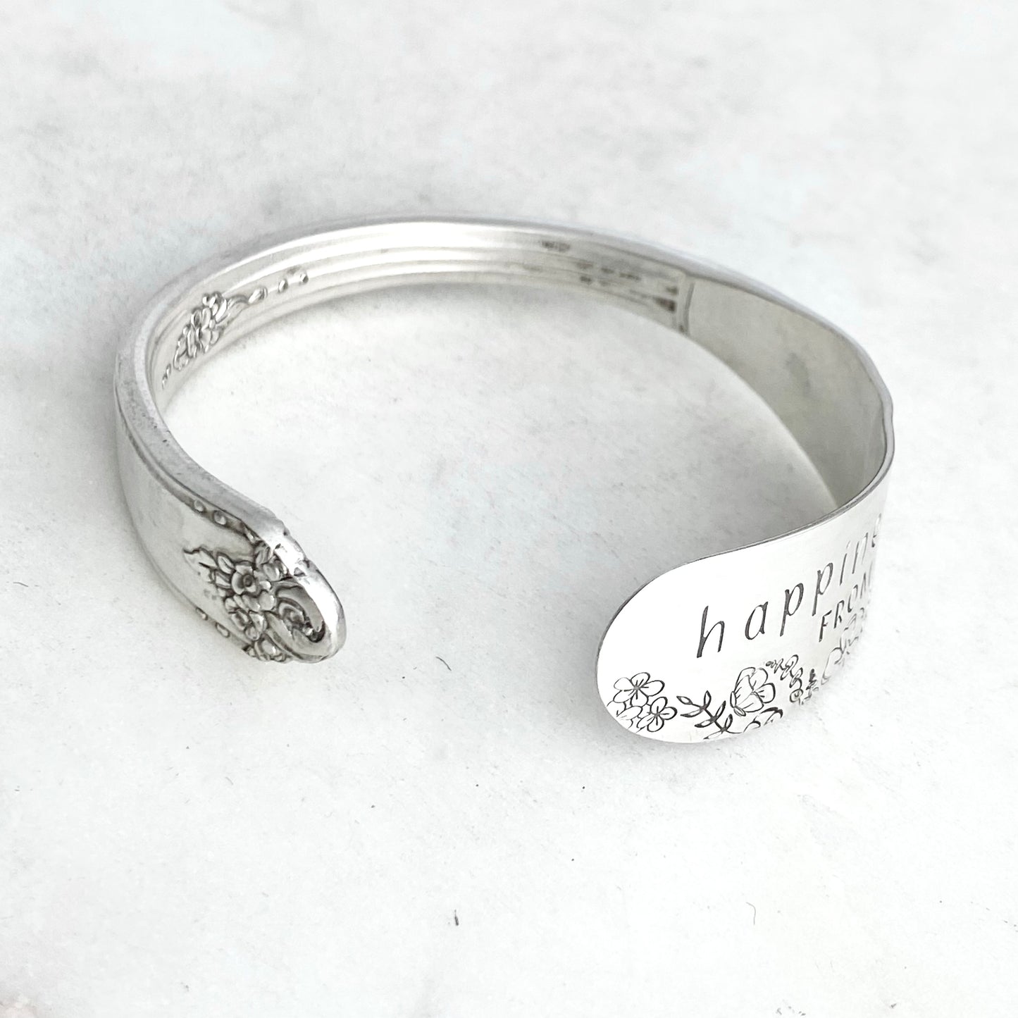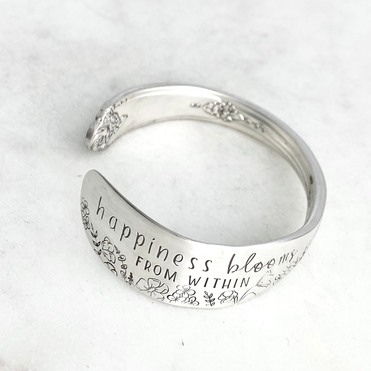 Happiness Blooms from Within, Sweet Briar 1948, Cuff Bracelet, Hand Stamped Vintage Spreader