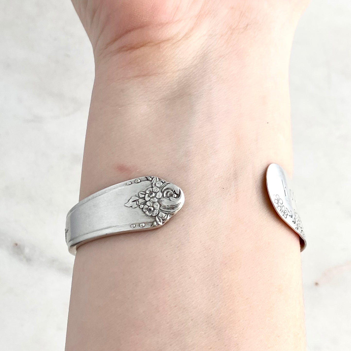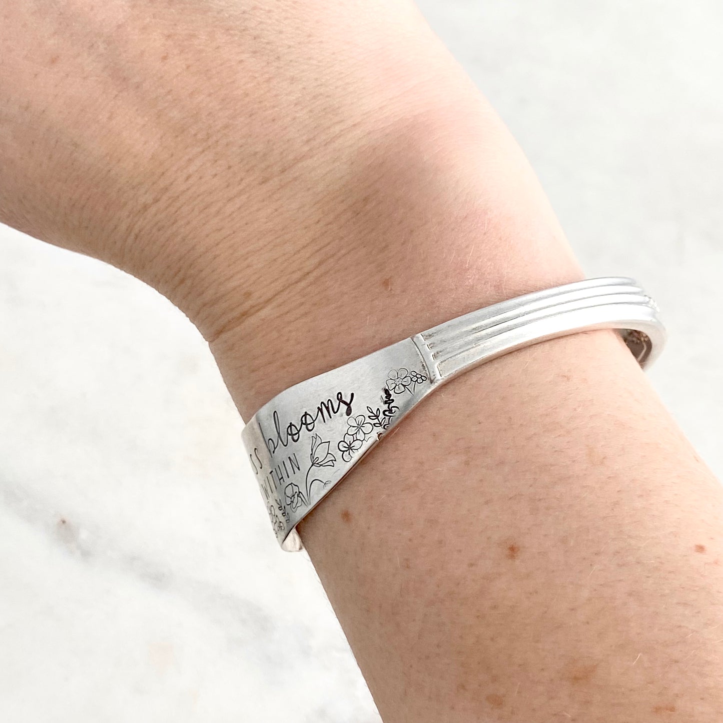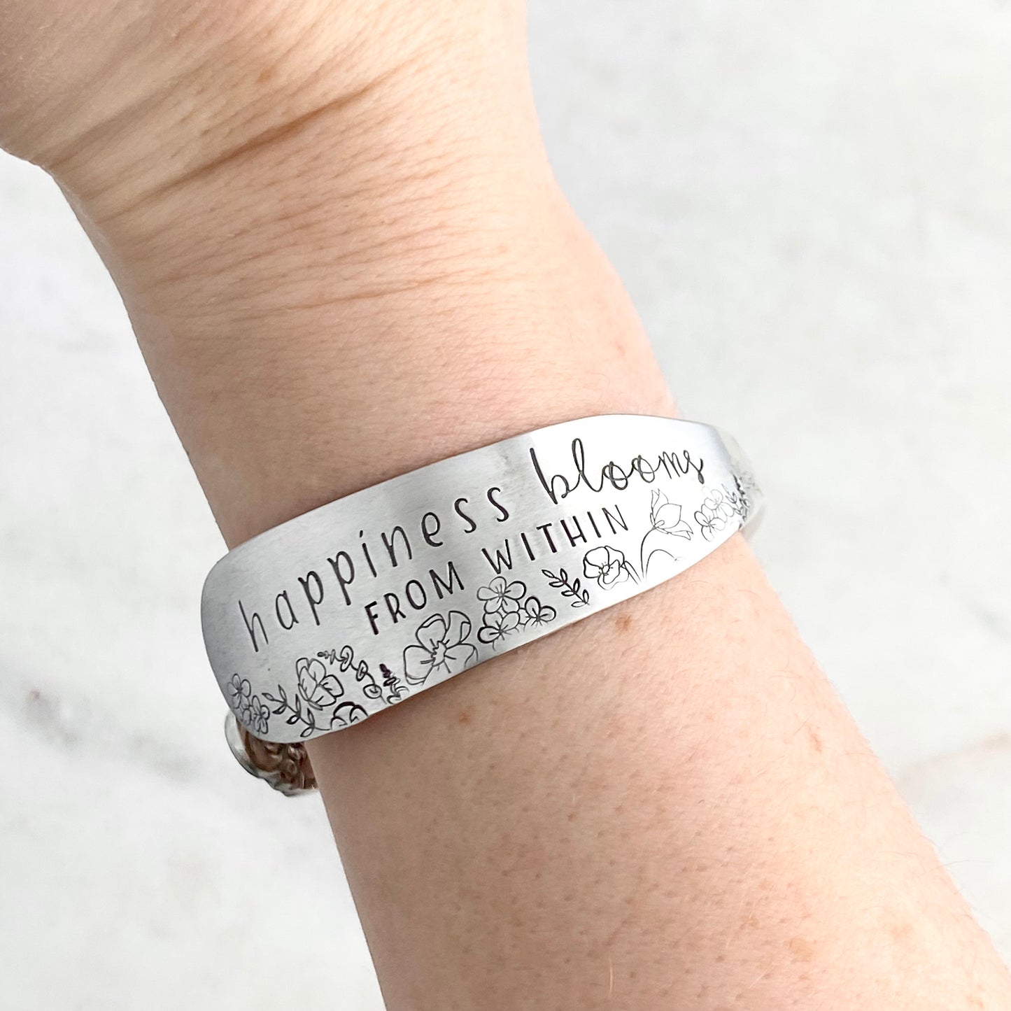 Happiness Blooms from Within, Sweet Briar 1948, Cuff Bracelet, Hand Stamped Vintage Spreader