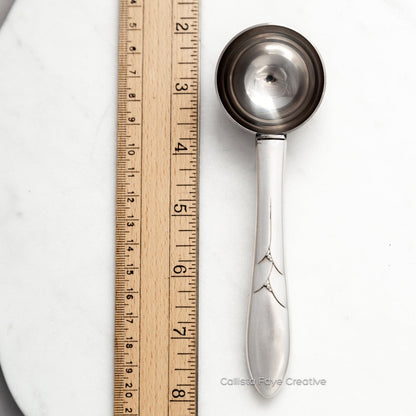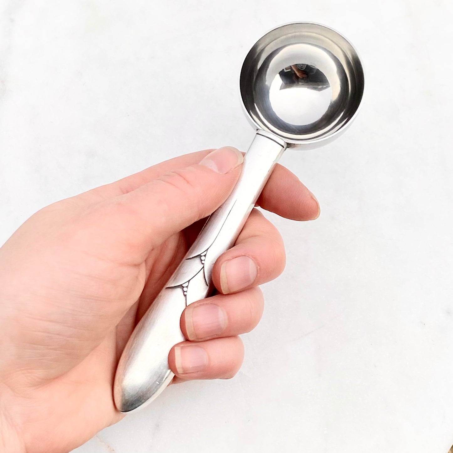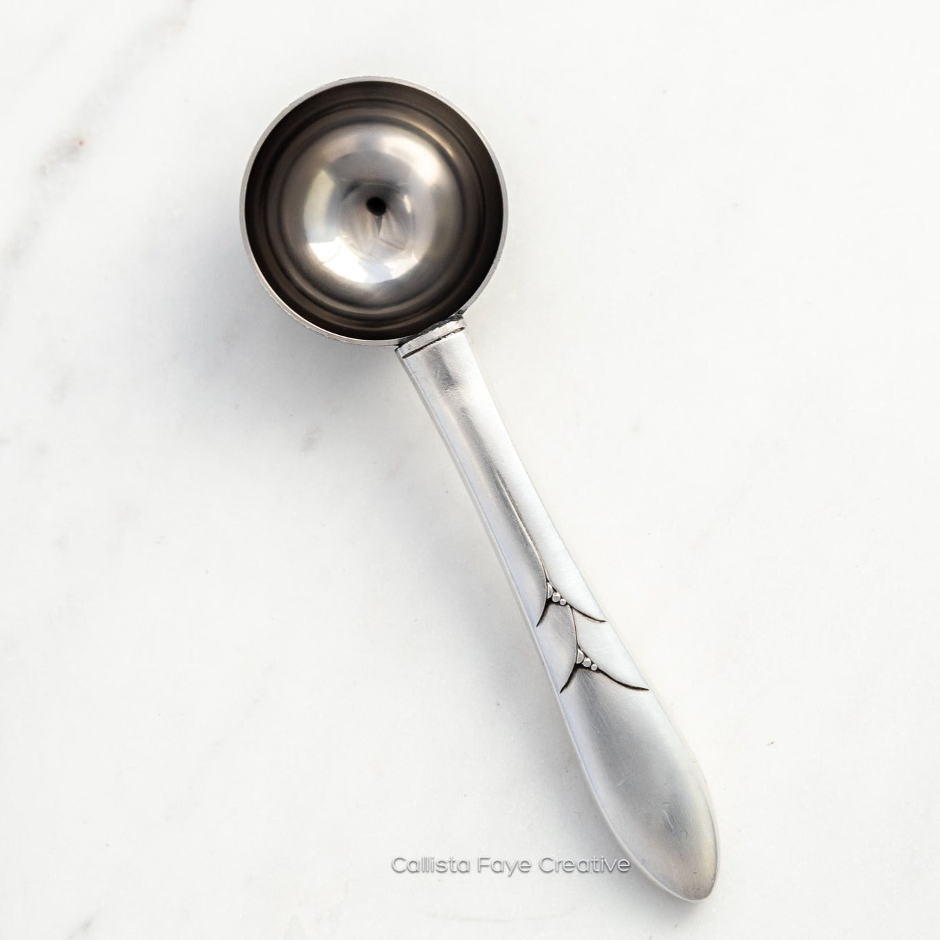 This coffee measuring spoon has been made from the handle of a vintage dinner knife. Scoop measures 2 Tbsp (30 mL).