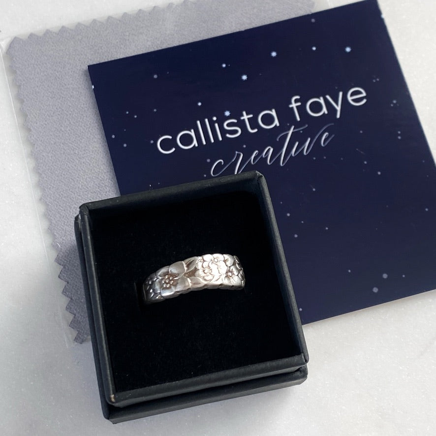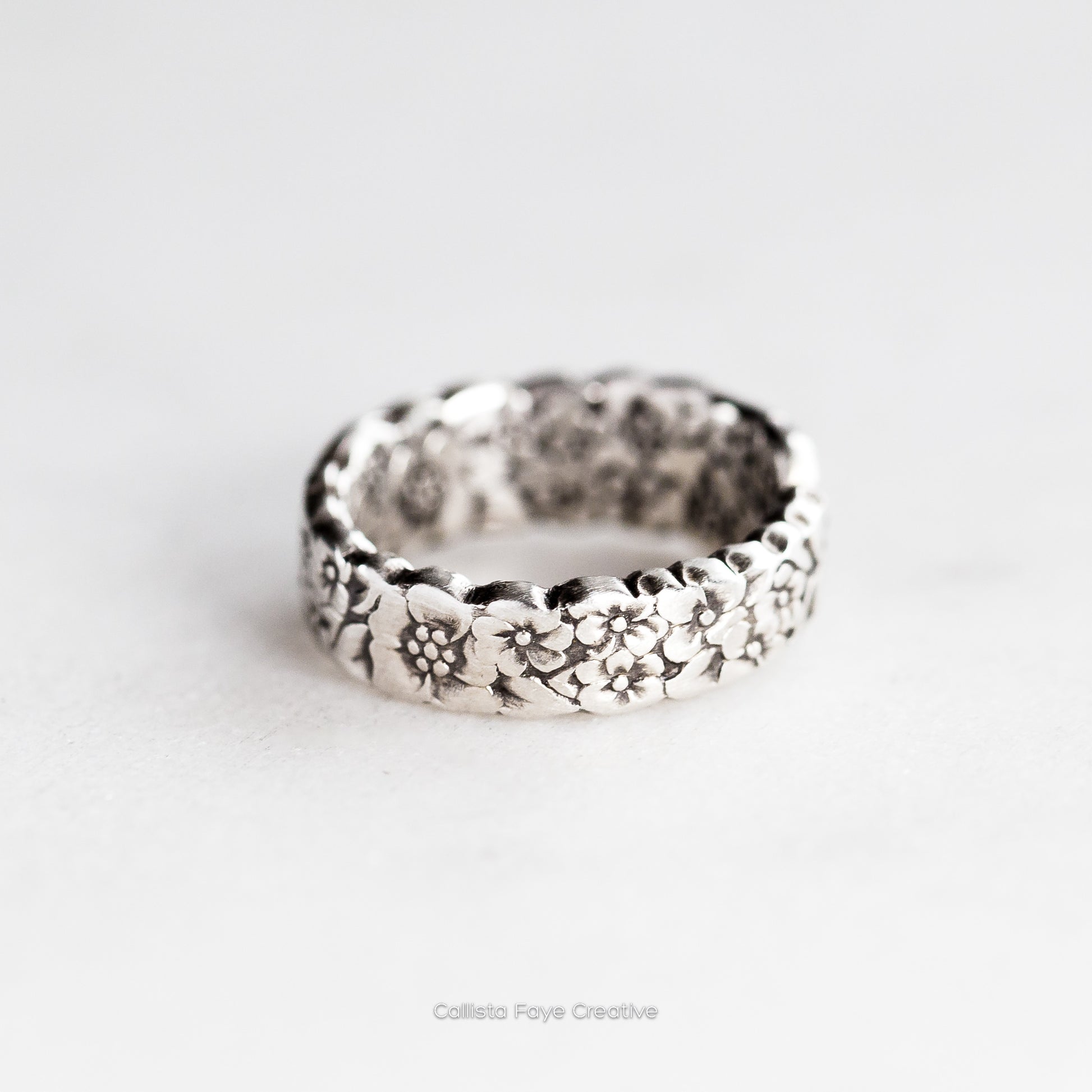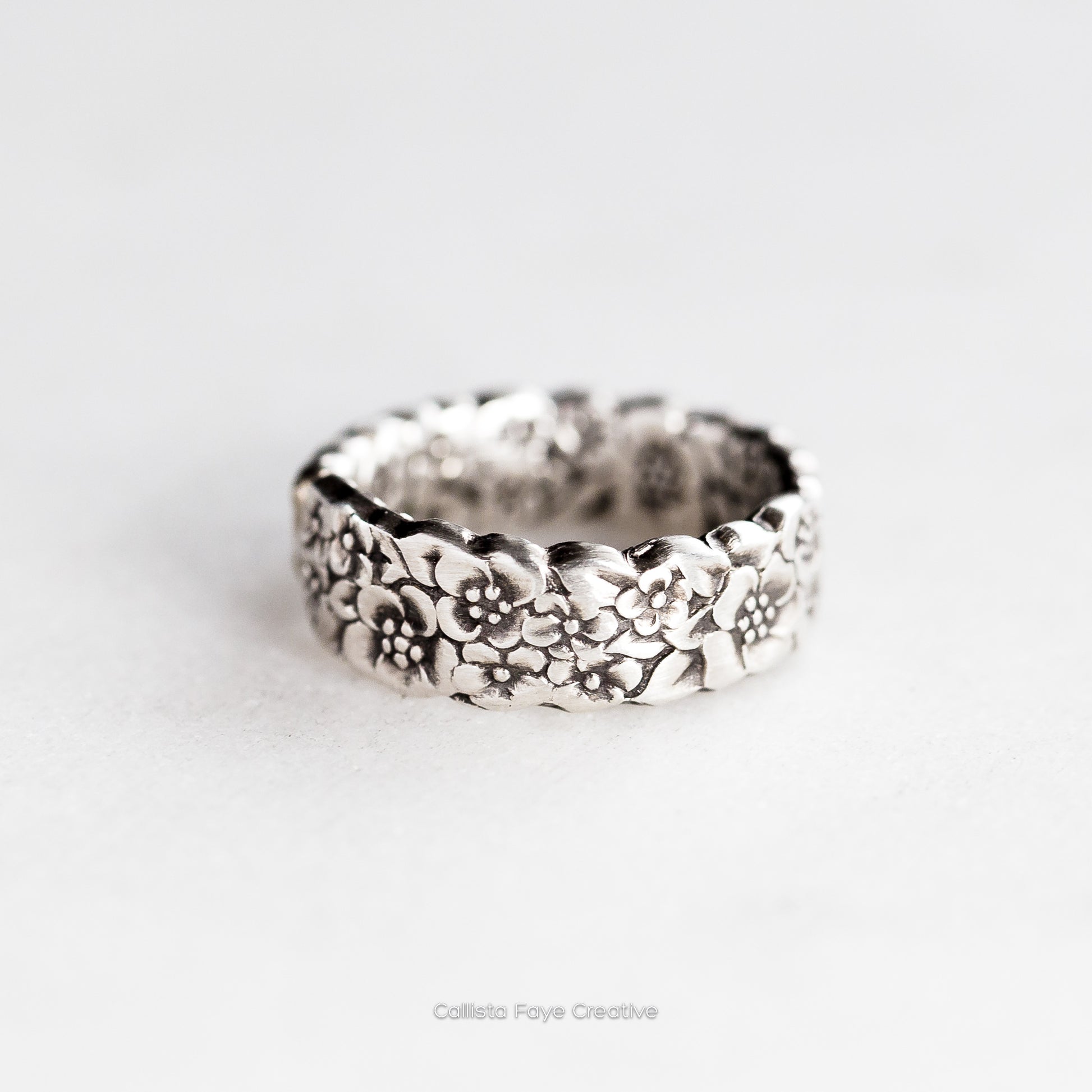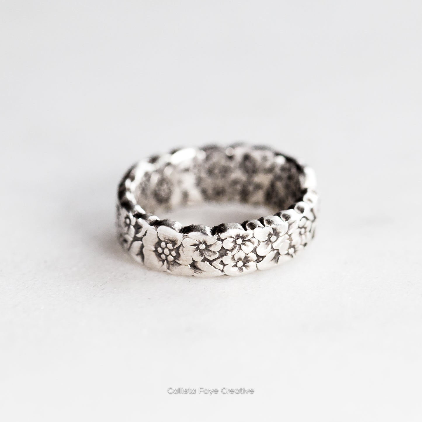 This is a spoon ring made from a teeny-tiny demitasse spoon, from the rare silverware pattern, Love aka Precious Flower from 1970. Own one of only a few pieces ever made available, transformed into a beautiful piece of jewelry.