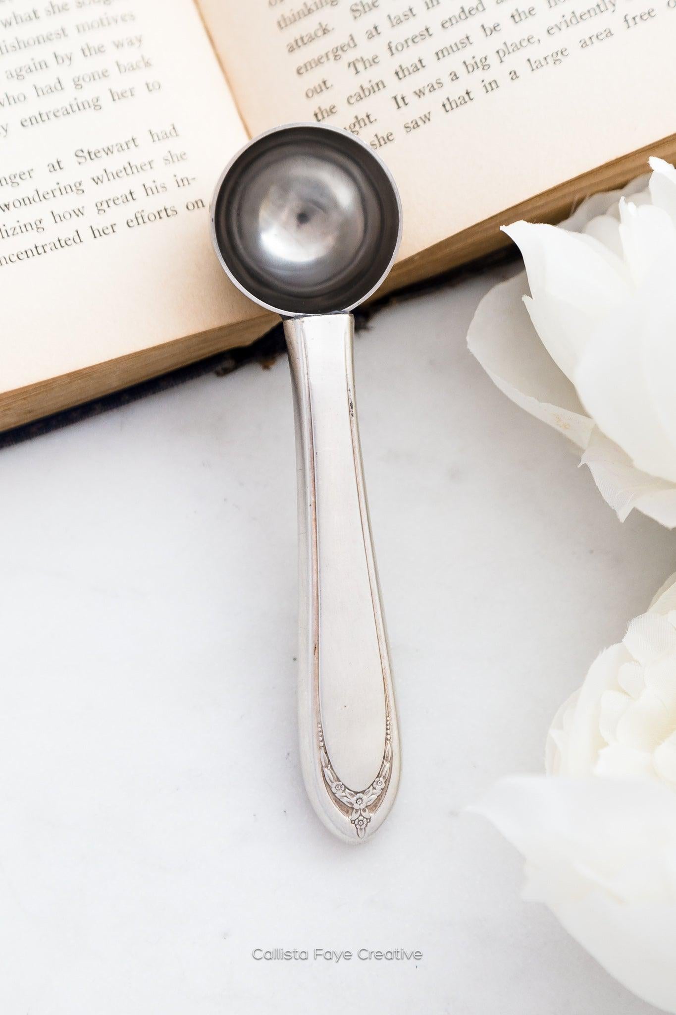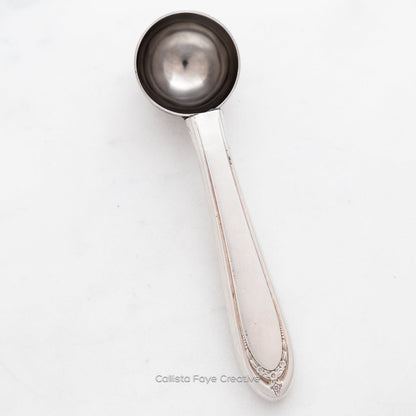This tea measuring spoon has been made from the handle of a vintage dinner knife. Scoop measures 1 Tbsp (15 mL) - the "perfect spoon" for measuring loose tea according to a popular Canadian tea retailer.