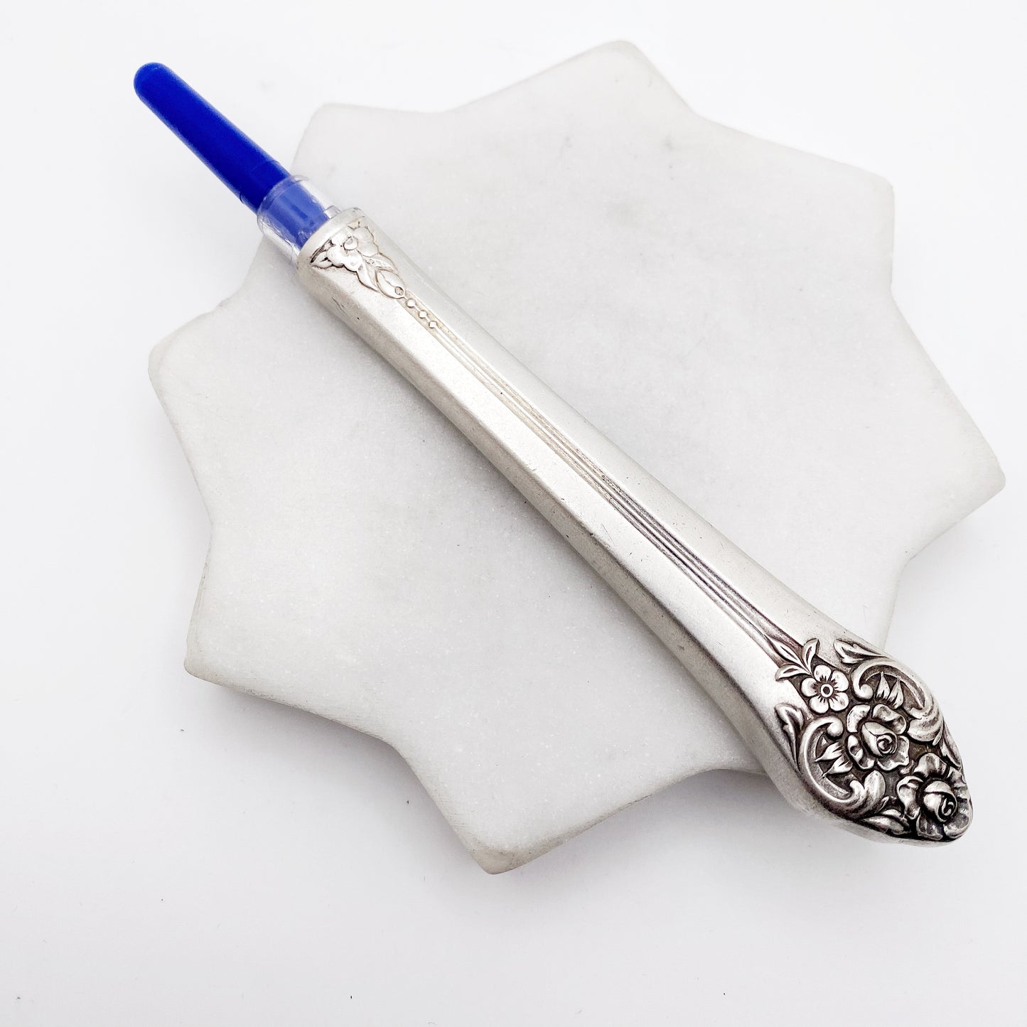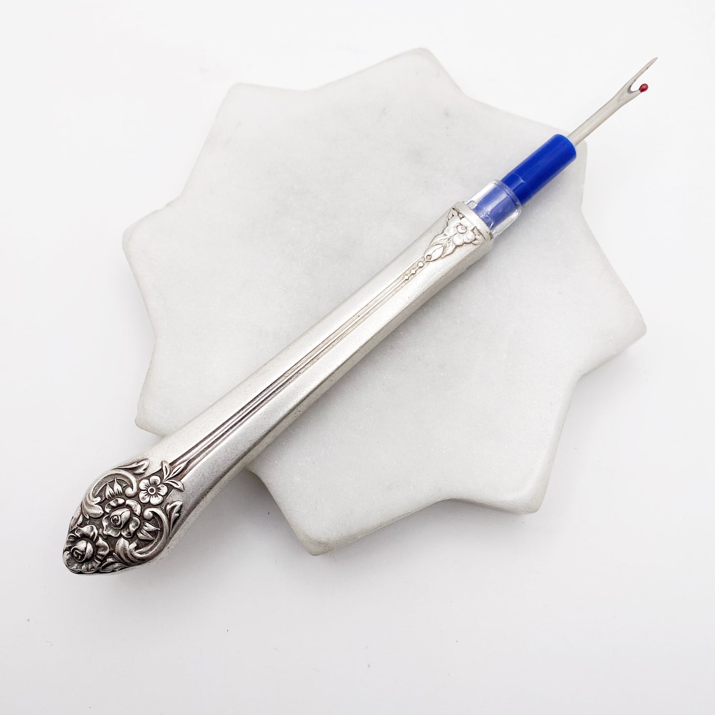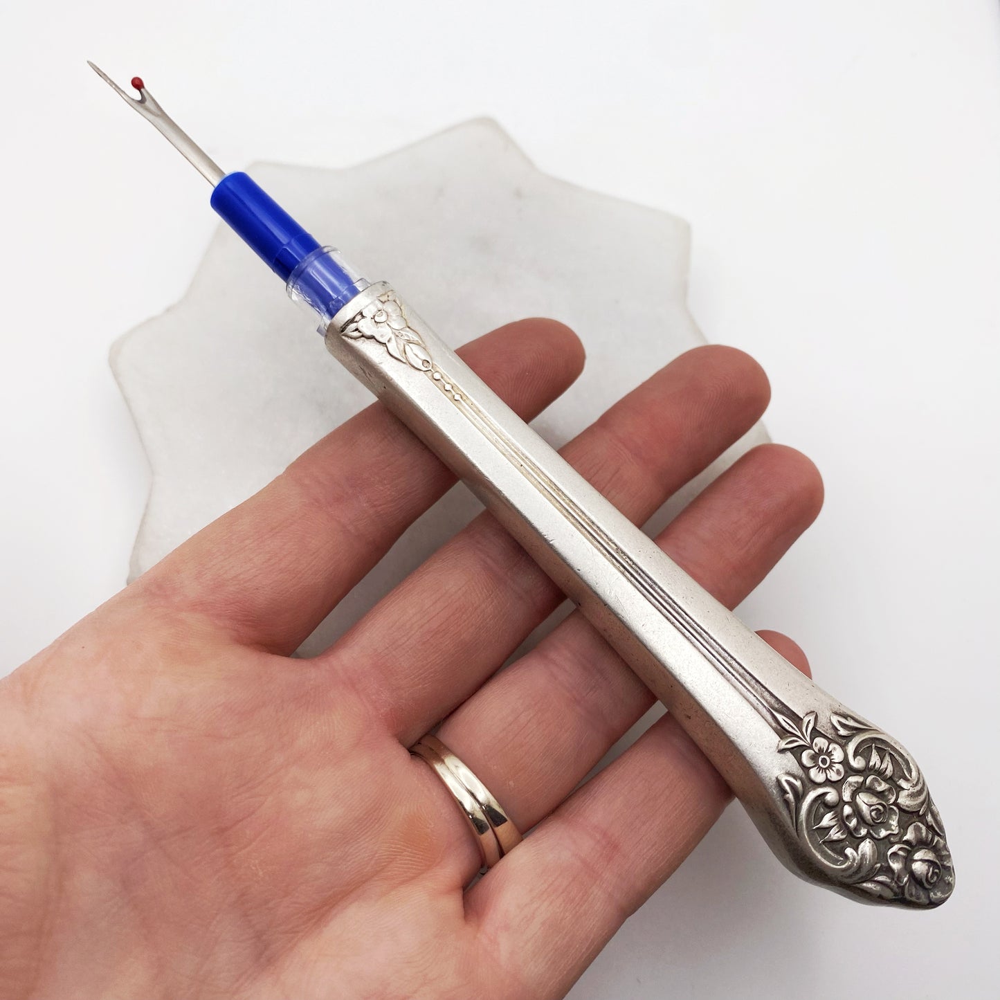 This seam ripper has been made from the handle of an antique dinner knife. Never lose your lid! The clear lid is fastened inside the vintage handle, simply flip the seam ripper around and it is ready to use. Your choice of several colours.