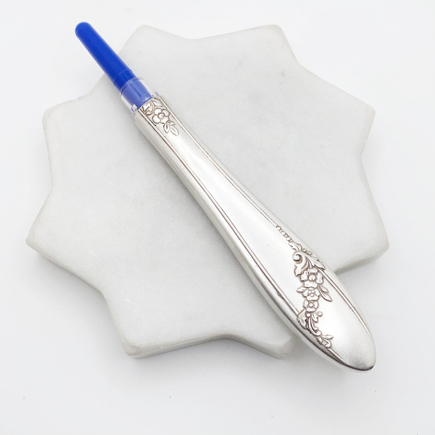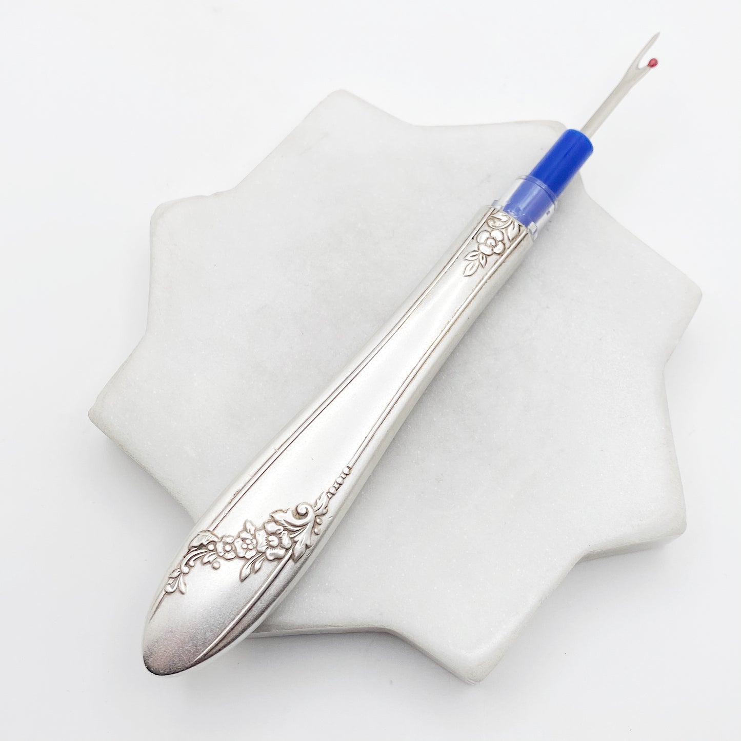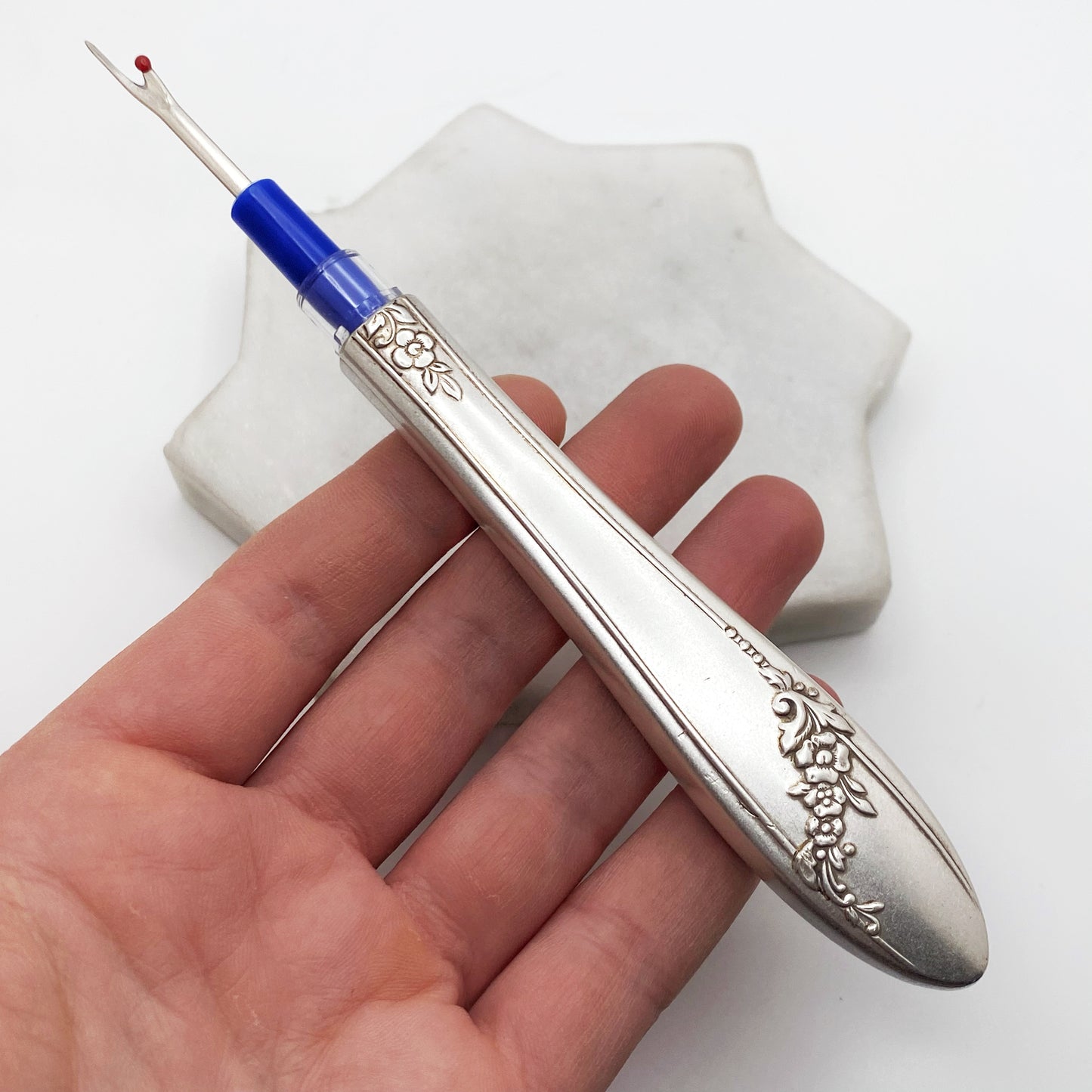 This seam ripper has been made from the handle of an antique dinner knife. Never lose your lid! The clear lid is fastened inside the vintage handle, simply flip the seam ripper around and it is ready to use. Your choice of several colours.