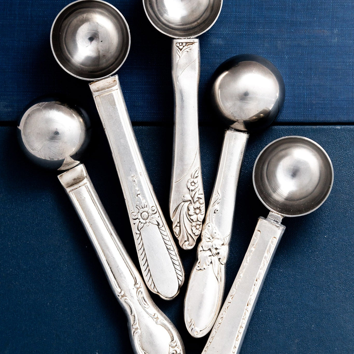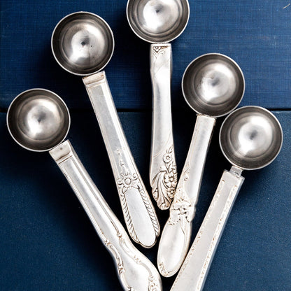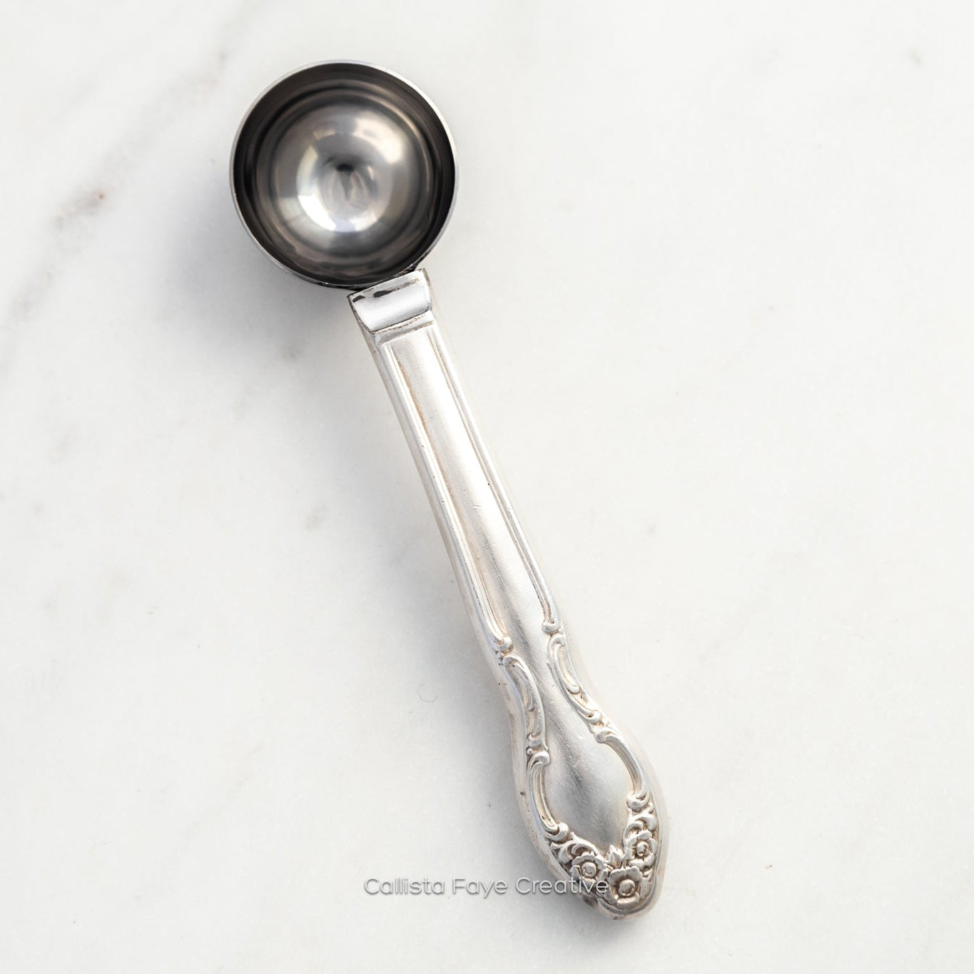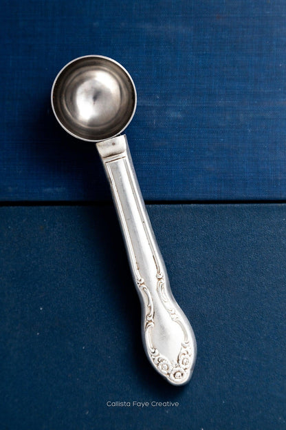 This tea measuring spoon has been made from the handle of a vintage dinner knife. Scoop measures 1 Tbsp (15 mL) - the "perfect spoon" for measuring loose tea according to a popular Canadian tea retailer.