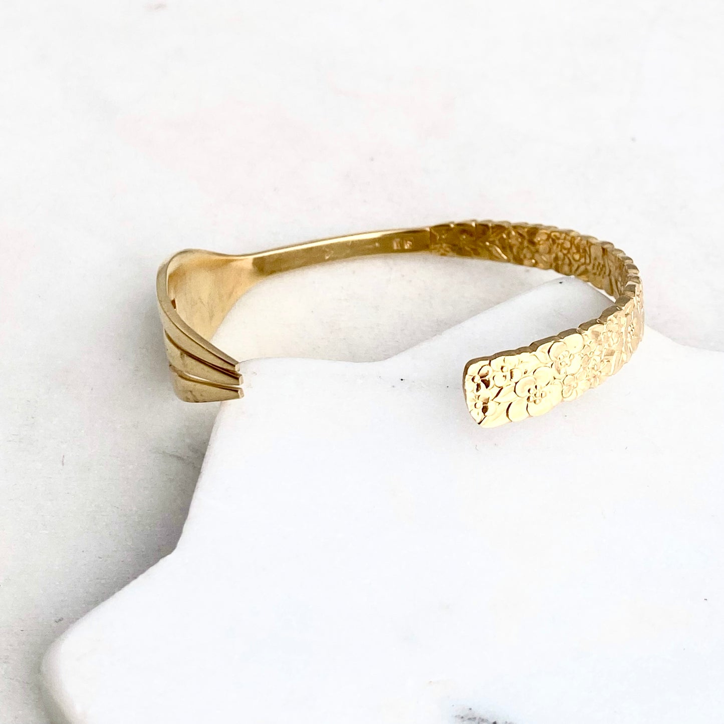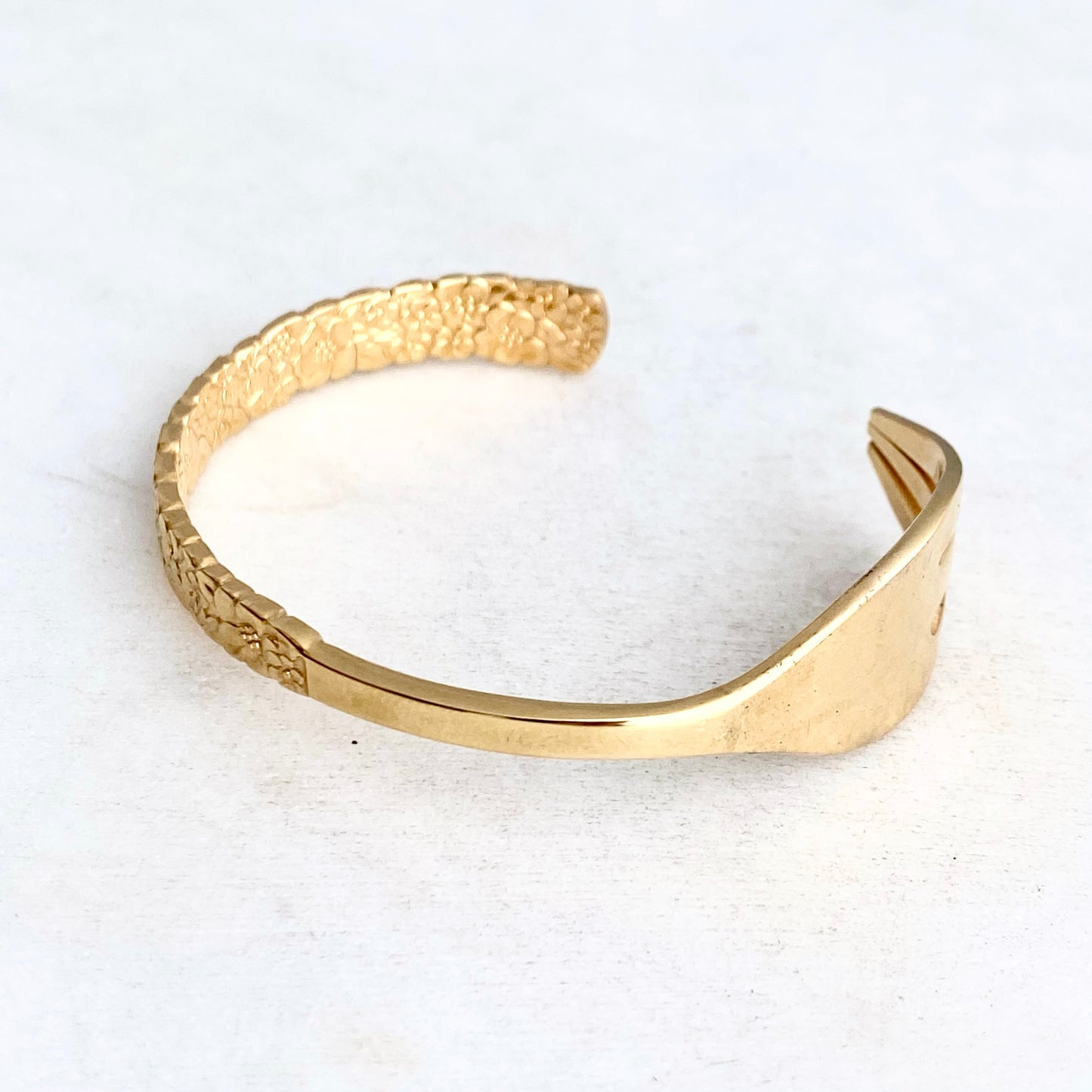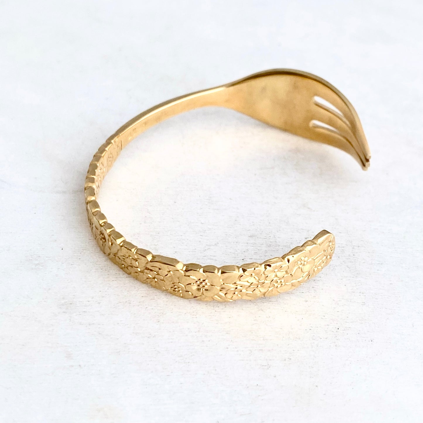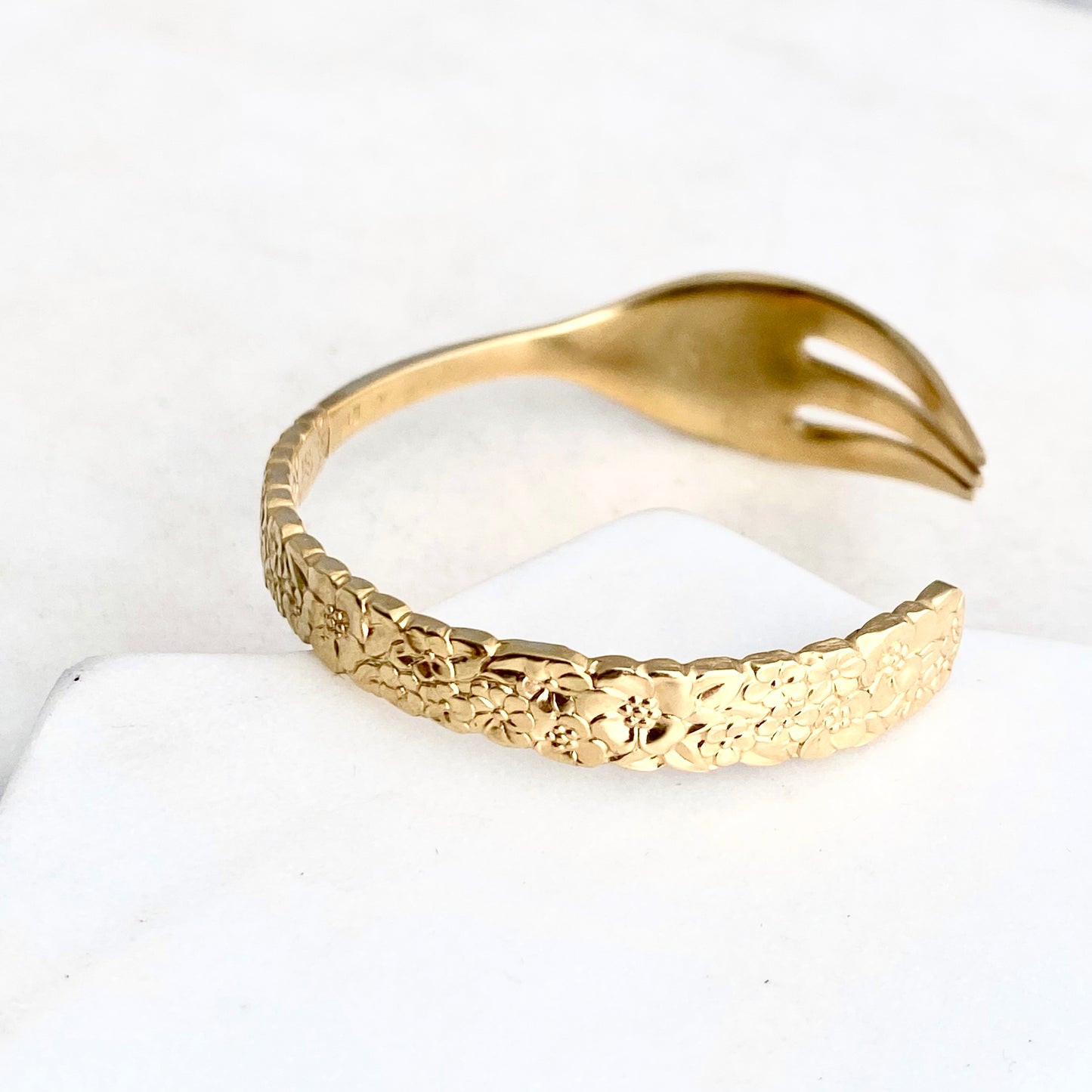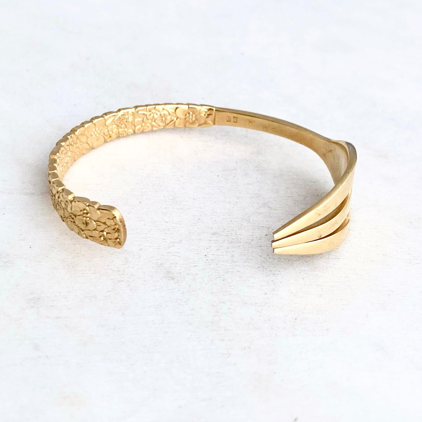 This is a bracelet cuff made from an elusive Cocktail Fork of the ultra rare golden flatware pattern, Love aka Precious Flower from 1970. It is so rare that many people don't even know that it was ever made in this gold version!