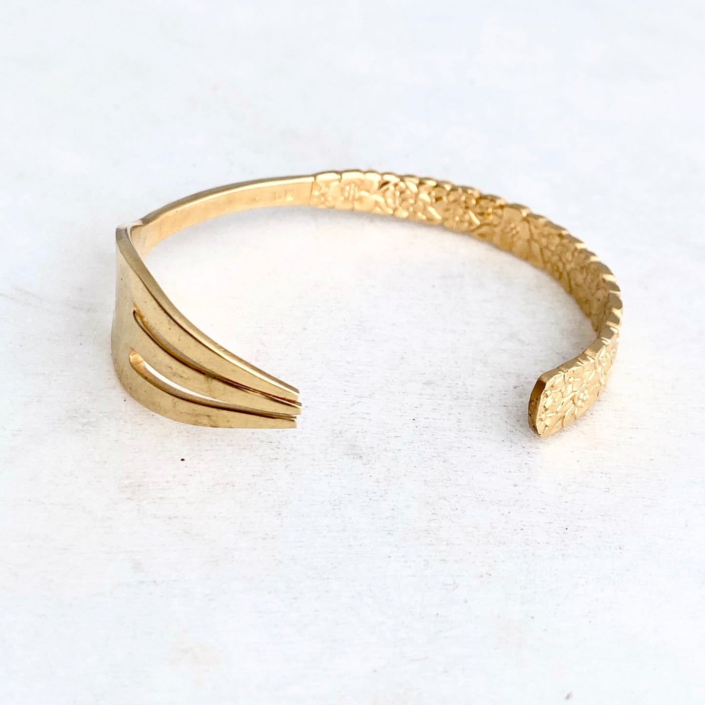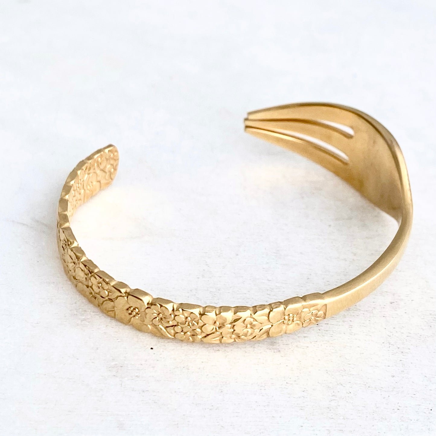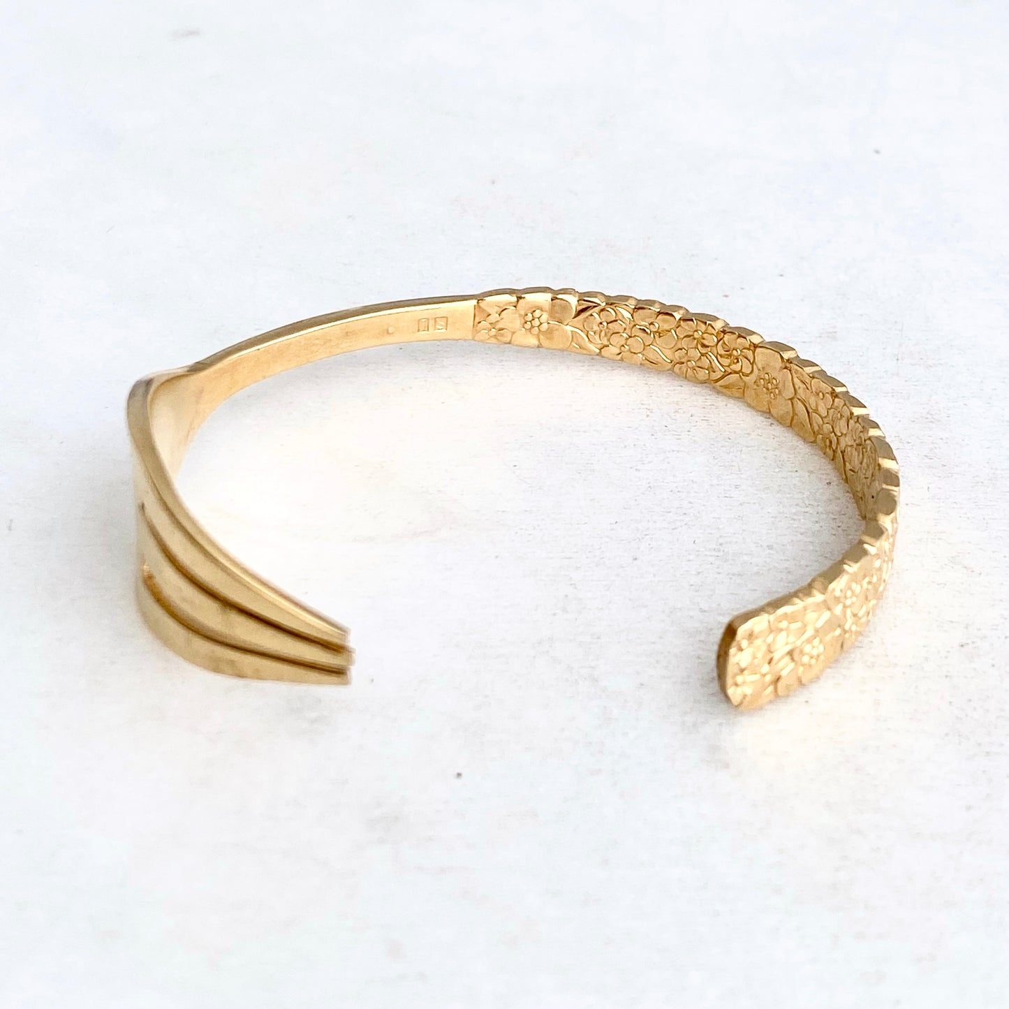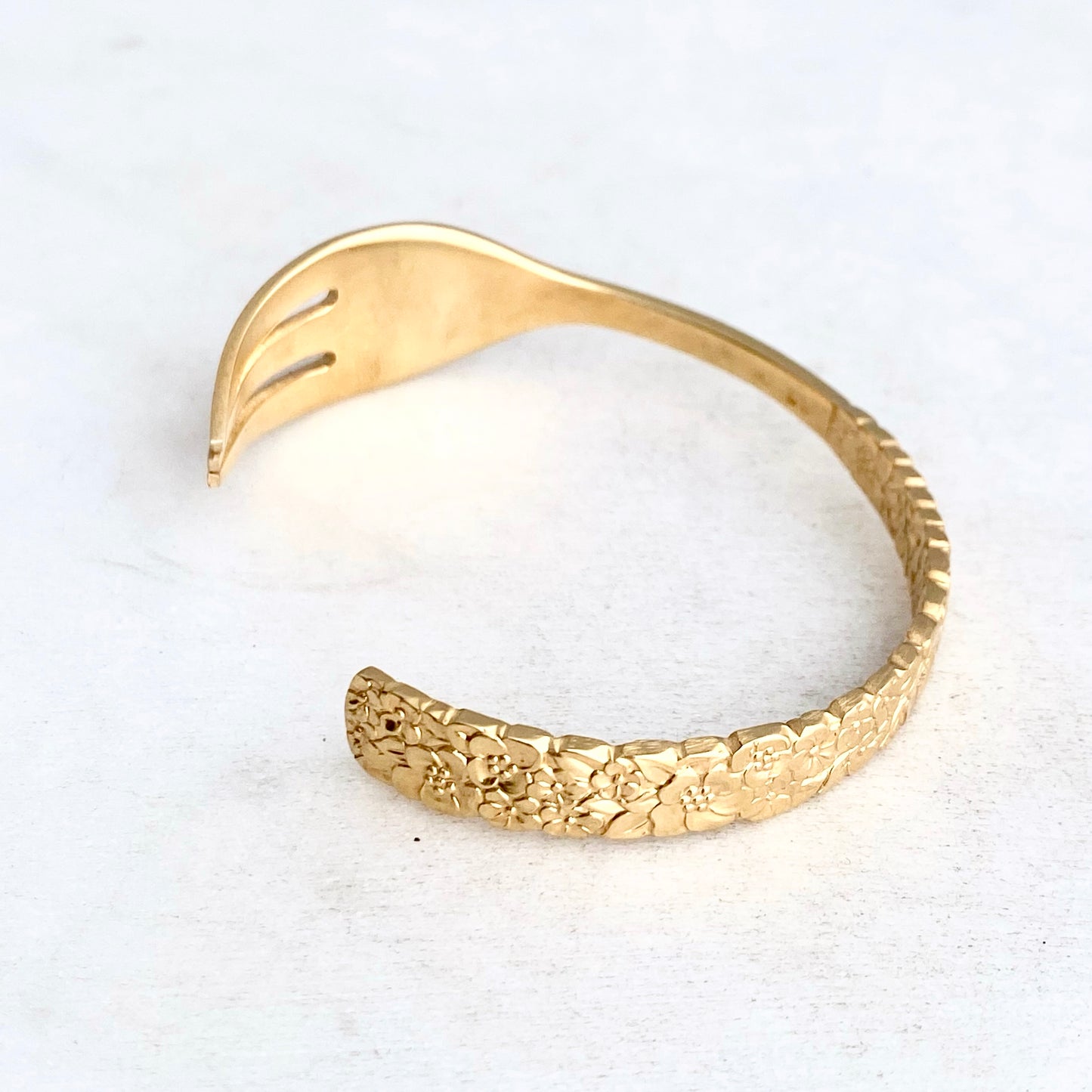 This is a bracelet cuff made from an elusive Cocktail Fork of the ultra rare golden flatware pattern, Love aka Precious Flower from 1970. It is so rare that many people don't even know that it was ever made in this gold version!