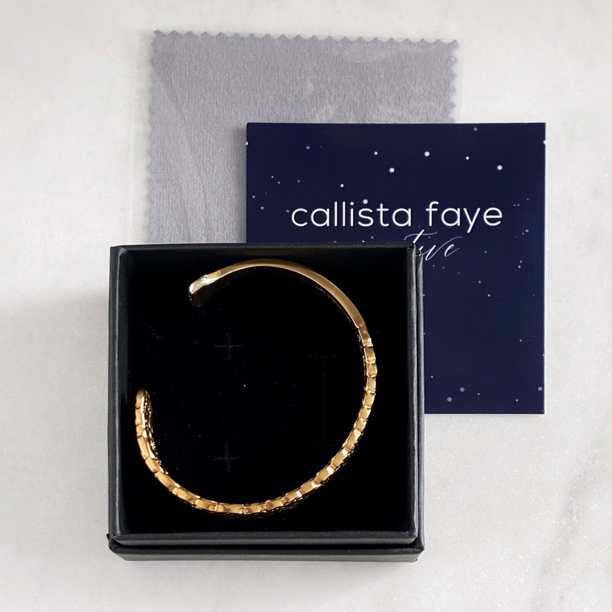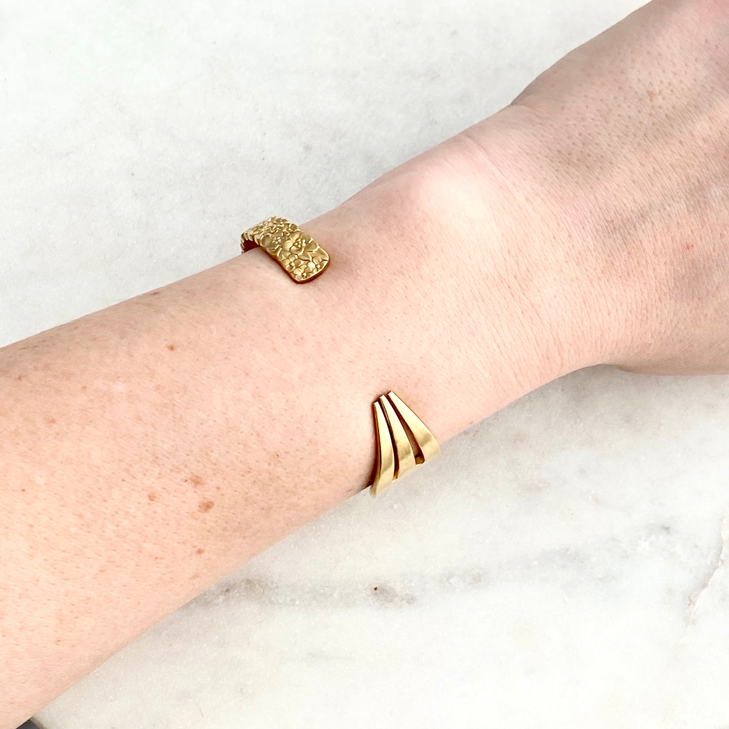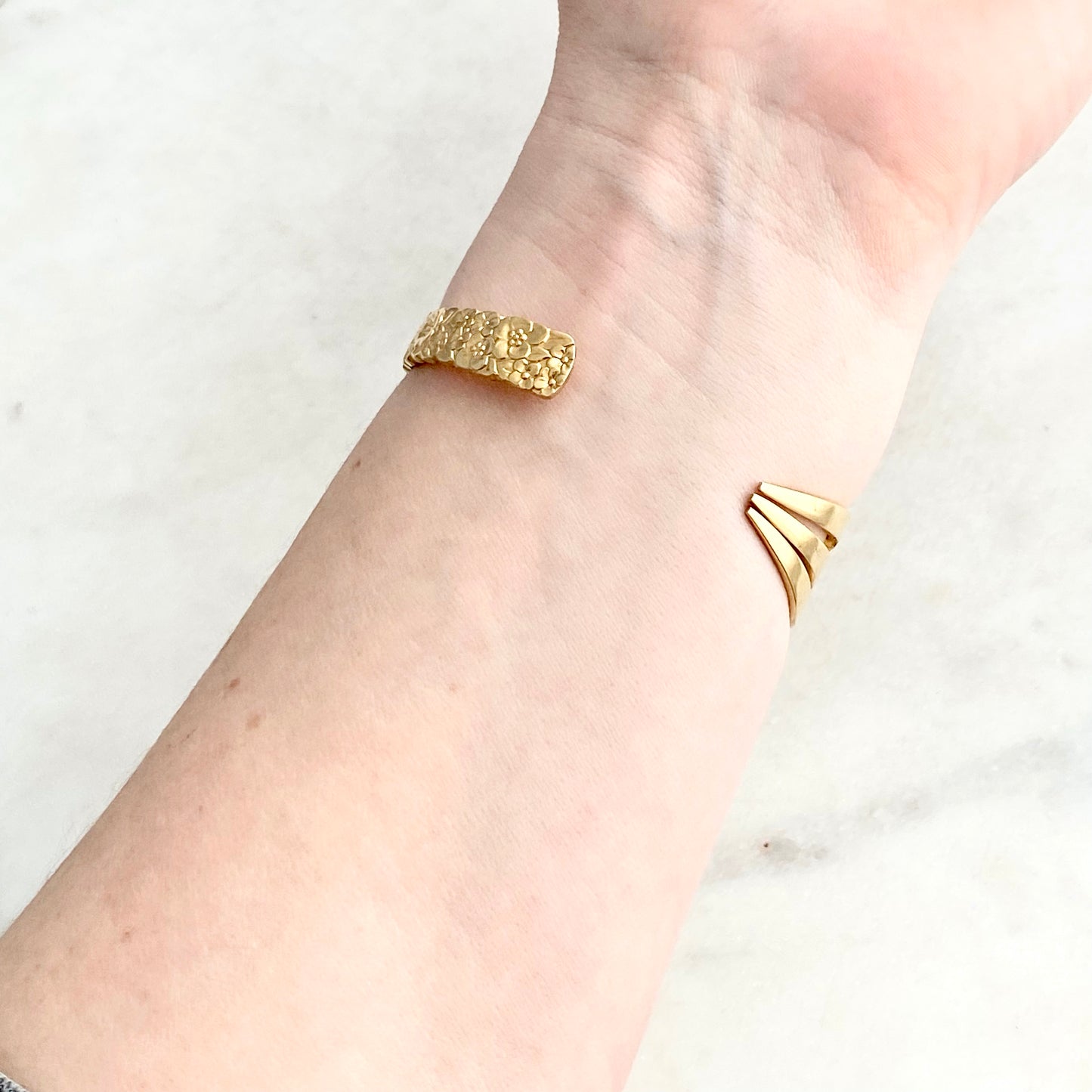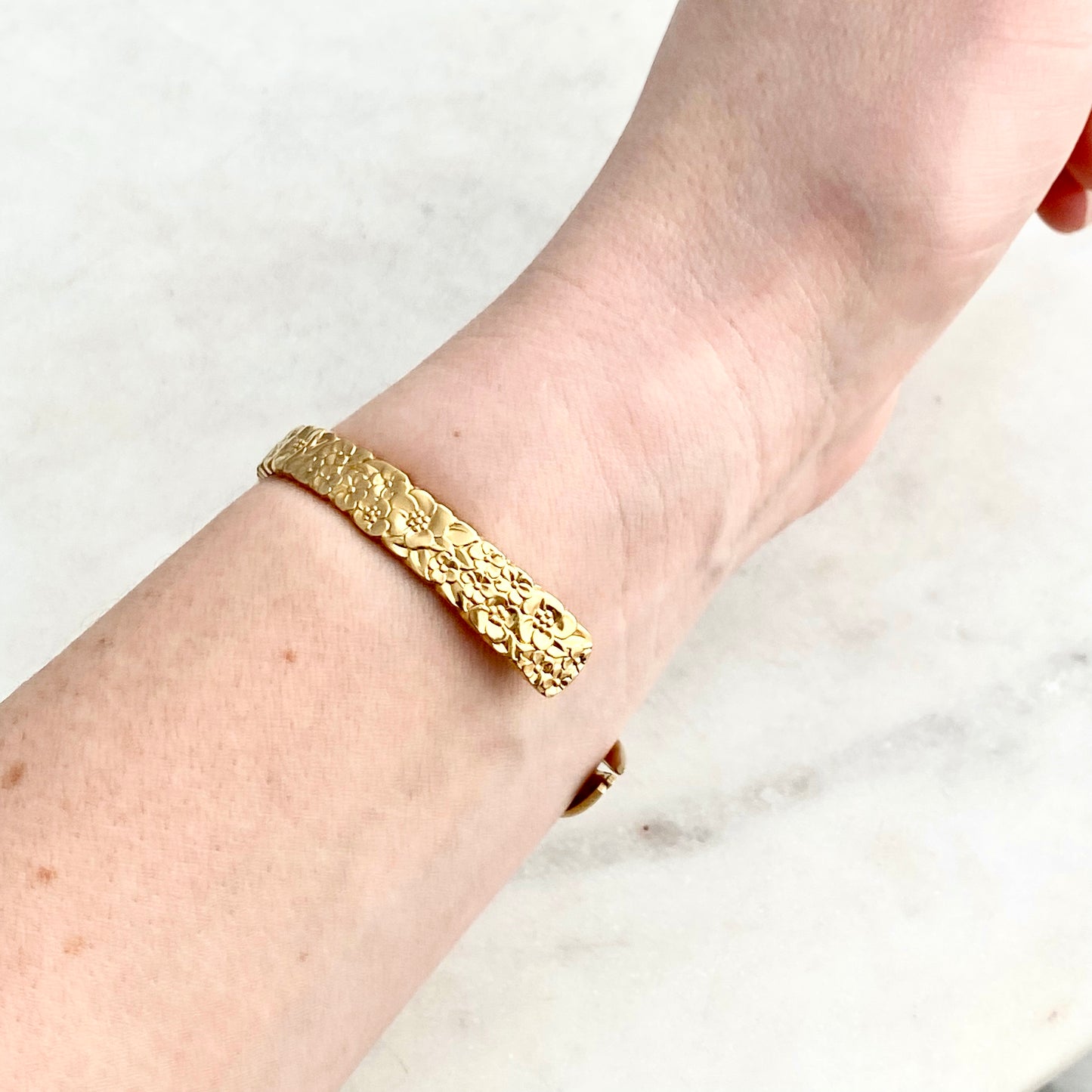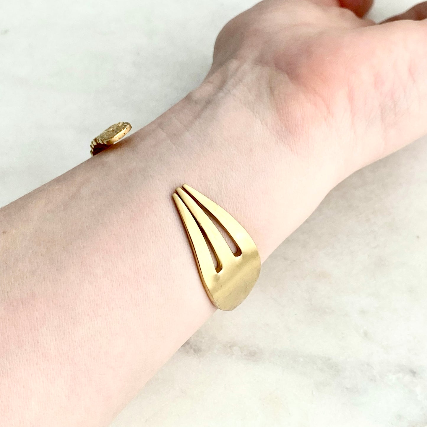 This is a bracelet cuff made from an elusive Cocktail Fork of the ultra rare golden flatware pattern, Love aka Precious Flower from 1970. It is so rare that many people don't even know that it was ever made in this gold version!
